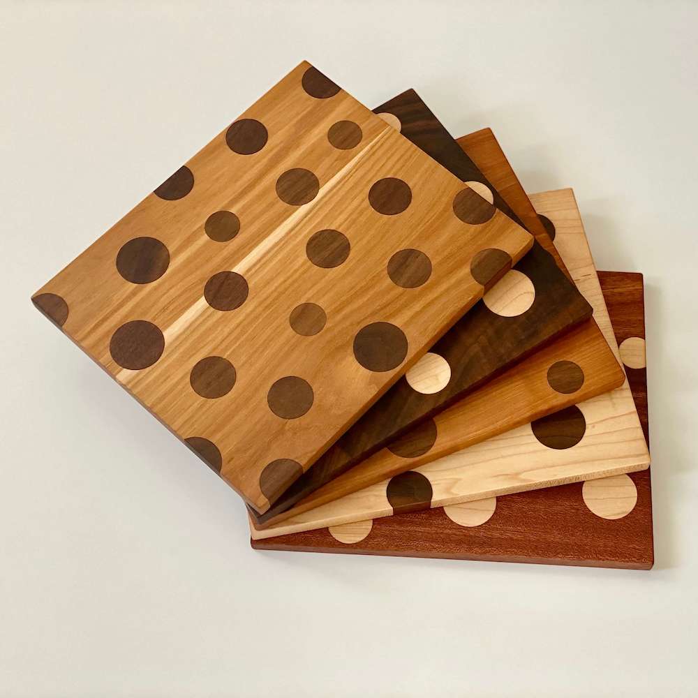 First, we select the rough wood and prep it for gluing into large blanks. The shapes are precisely cut from a single wood; or for patterns, cut from different woods then pieced together like a puzzle. The blanks are cut to size, the surfaces planed and edges detailed. Each board is sanded to a satiny smooth finish using progressively finer grits of sandpaper then food grade mineral oil and natural beeswax are applied to seal and protect the wood.